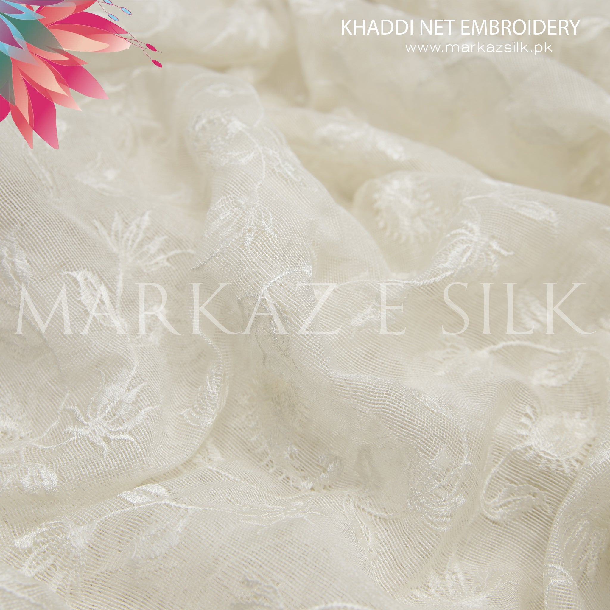 Discover the elegant charm of our Premium Khaddi Net Embroidery Fabric – MS-657, available per yard for custom tailoring and creative fashion projects. This beautifully textured Khaddi net embroidered fabric is designed to elevate your garments with a refined and graceful finish. Perfect for formal wear, festive outfits, party wear, and designer creations, this net fabric is ideal for dresses, overlays, dupattas, and custom stitched pieces.