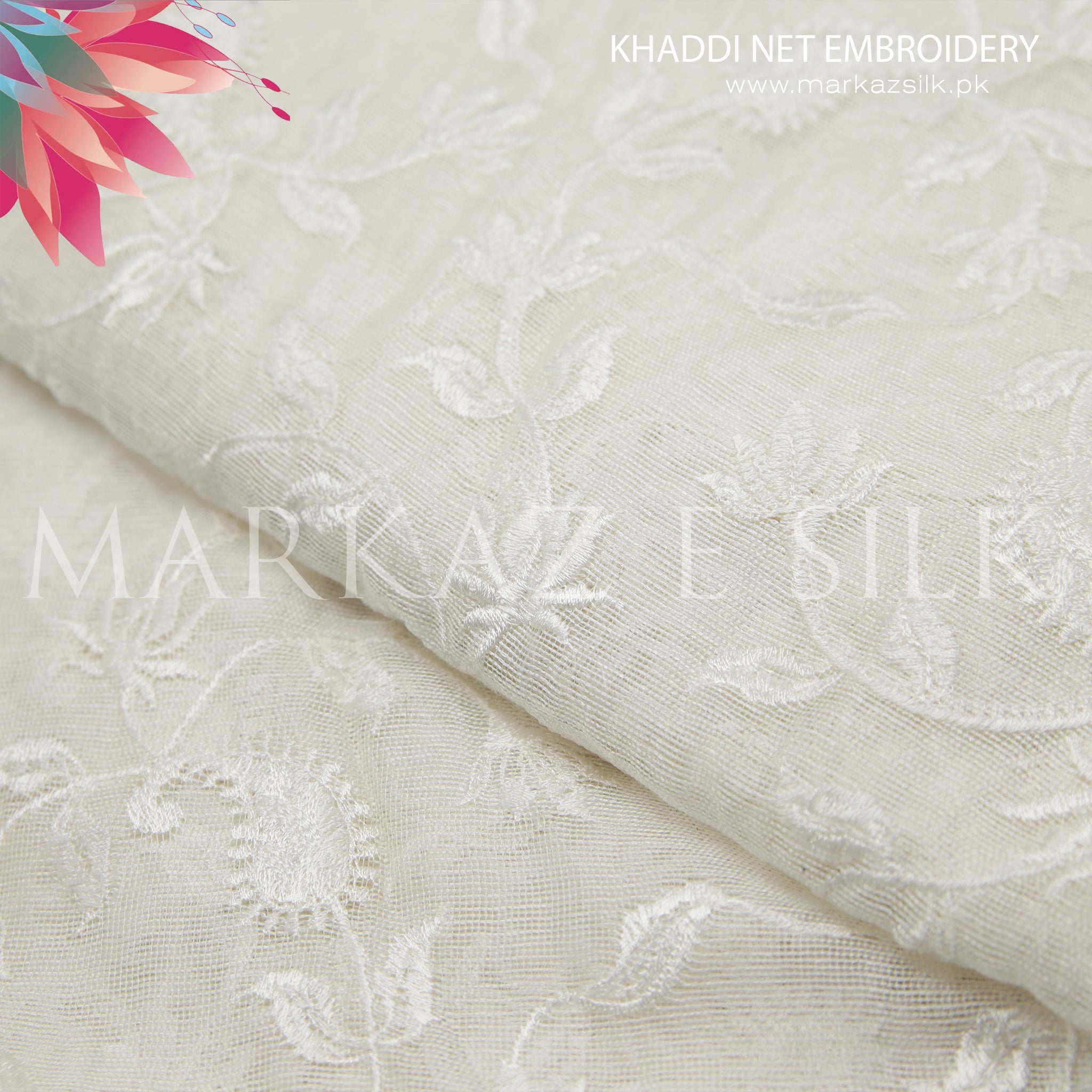Premium Khaddi net embroidered textile — perfect for bespoke designs