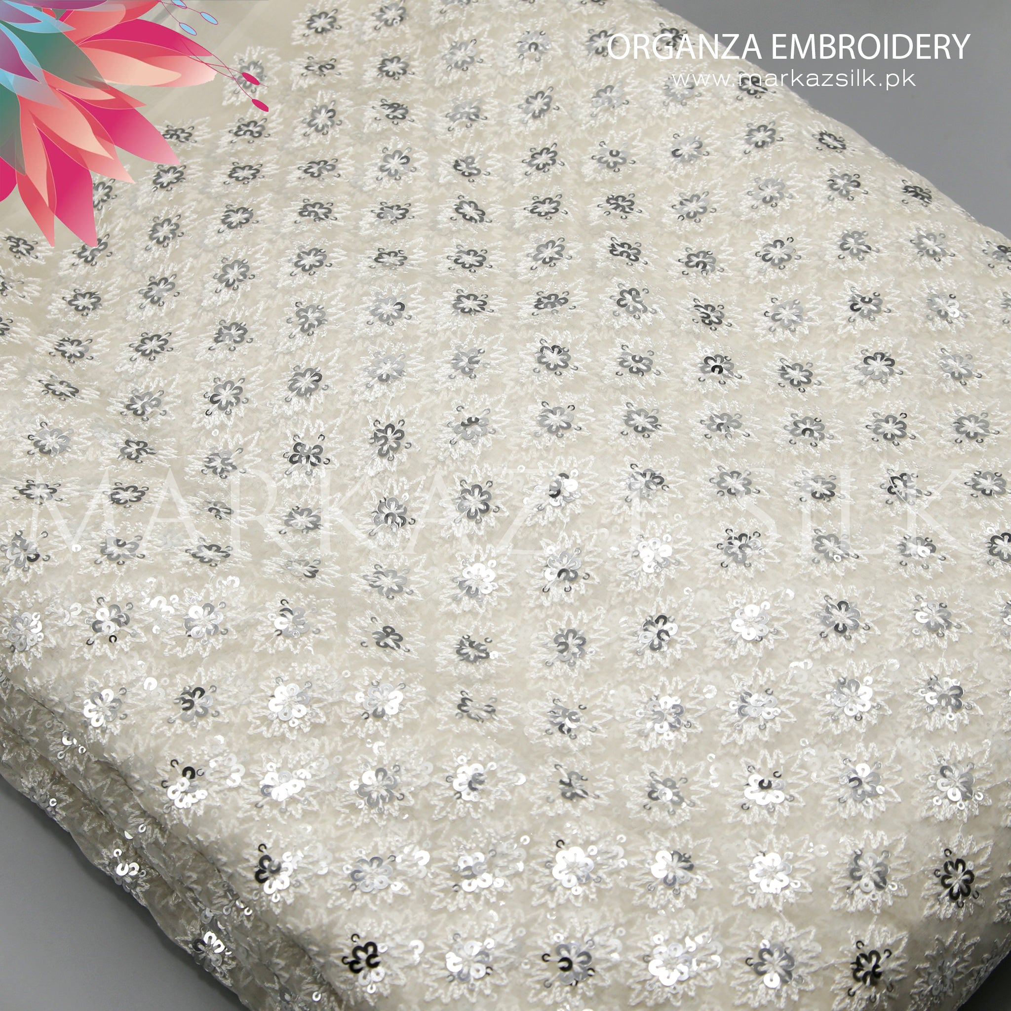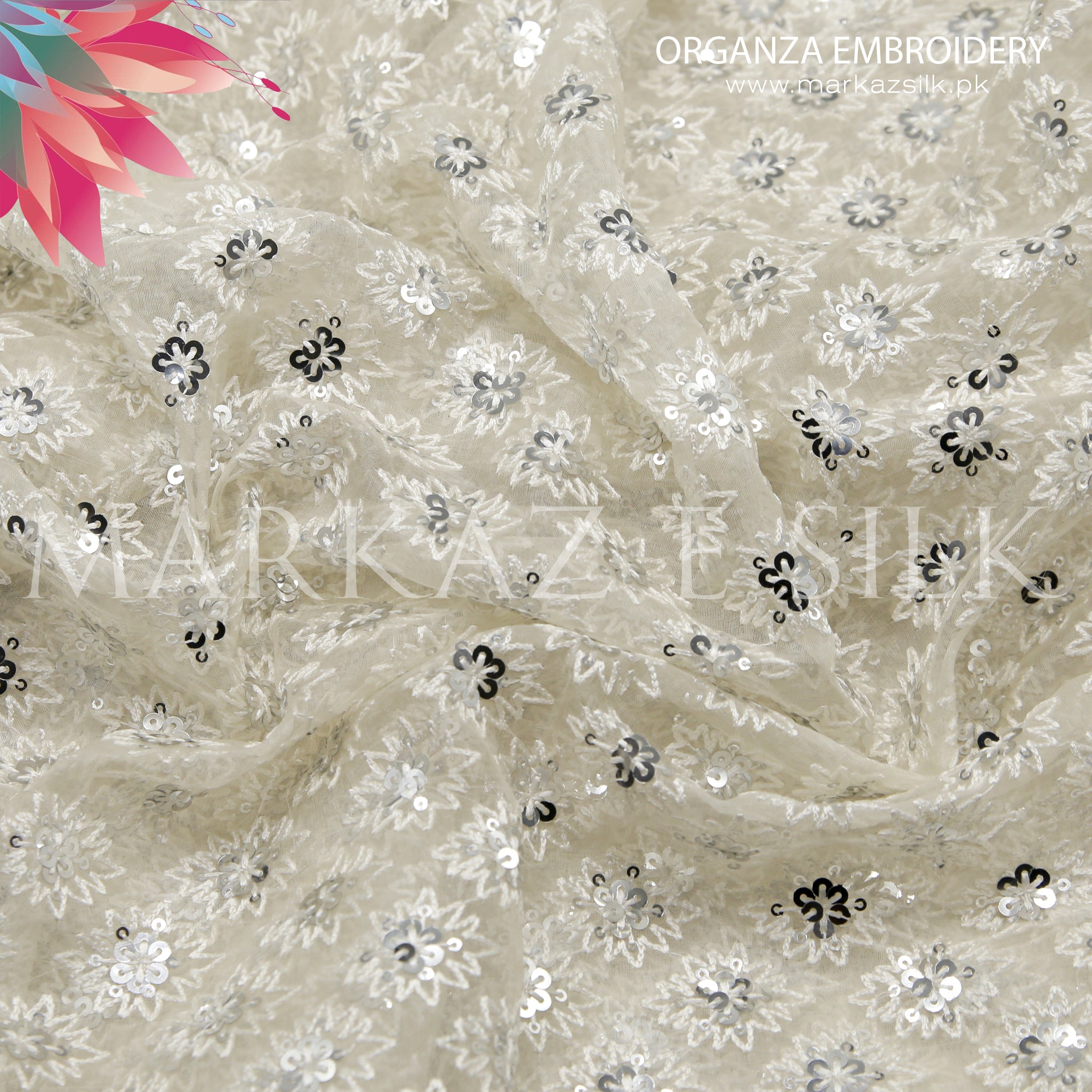 Whether you're stitching couture garments or working on luxury décor, MS-737 provides a refined base for both manual embroidery and machine work. The subtle shine of the organza combined with sequined detailing makes each piece stand out and adds a radiant finishing touch.