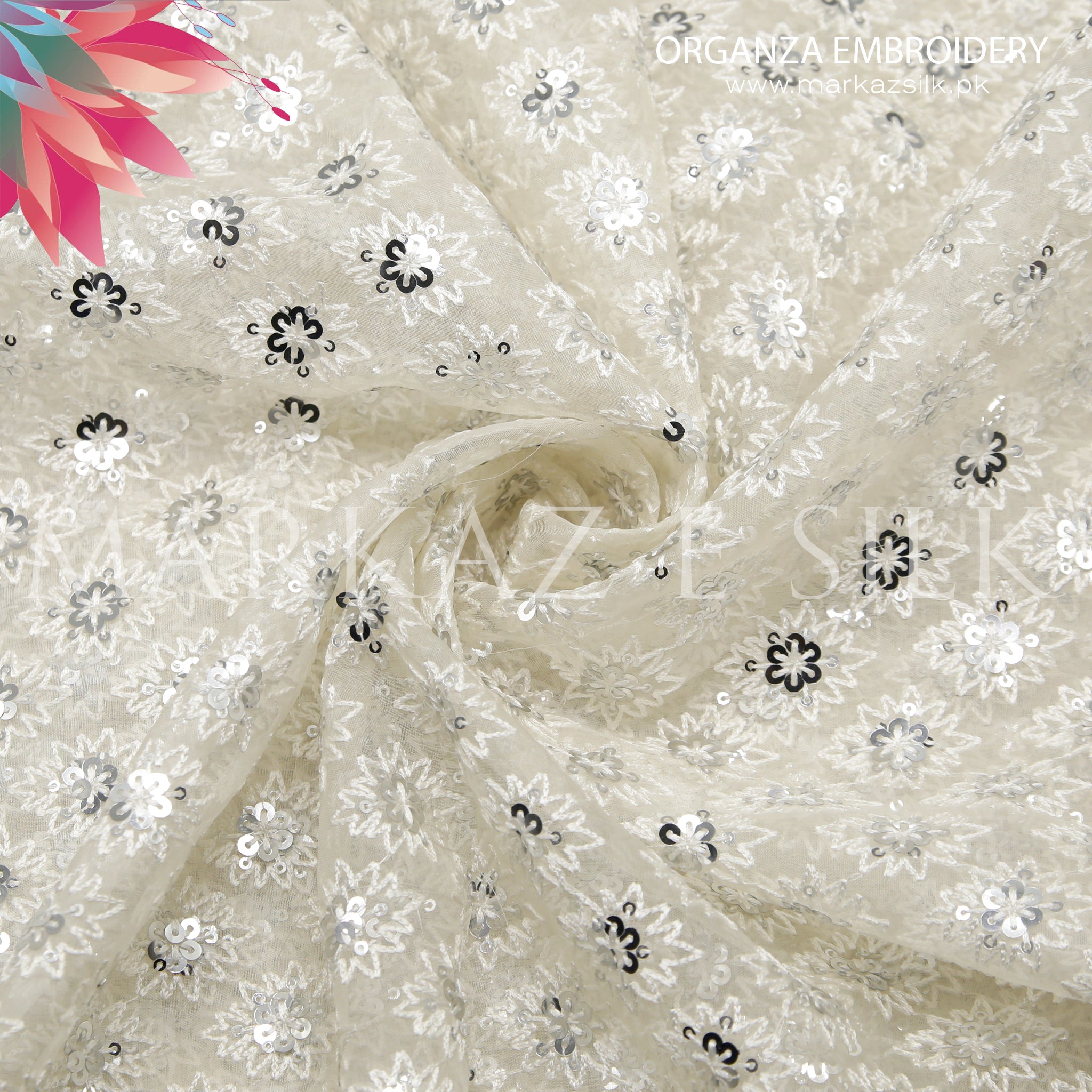 Elevate your creations with our Organza Embroidery – MS-737, a luxurious and delicate fabric designed to bring elegance and sophistication to your projects. Crafted from pure medium-weight organza (20 gram), this fabric features intricate sequence embroidery that shimmers beautifully under light. With a width of 38 inches, it offers generous coverage per yard.